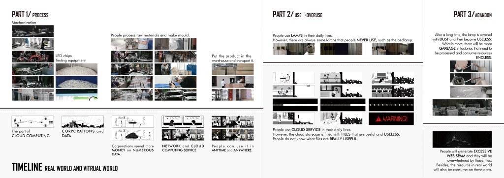 Due to the emergence of the second industrial revolution and the information revolution, the level of industrial production rose rapidly. People invent and produce many products to make life better. However, after reaching a critical point of time, production has transformed from positive to negative. People have become more greedy and are constantly producing products to satisfy their lust, thus consuming more resources. The artist brings people into reality and network virtual environment through the form of split-screen animation, leading viewers to think about people’s lifestyle and the relationship between human and environment.