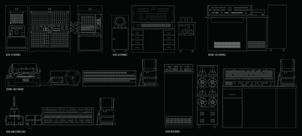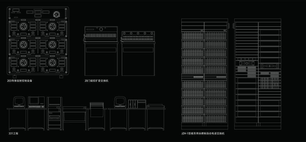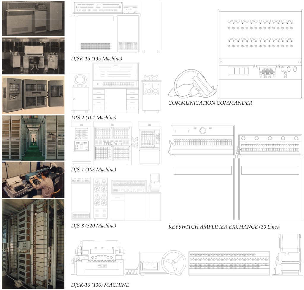 Line drawing of specific items such as different types of computer models produced by the 738 factory.
