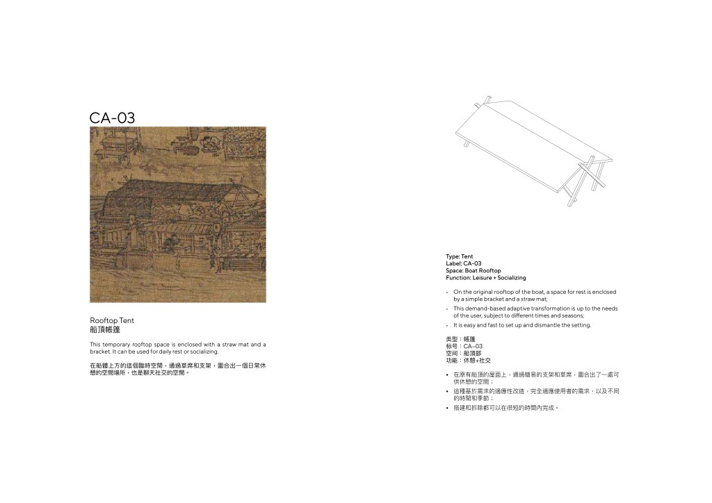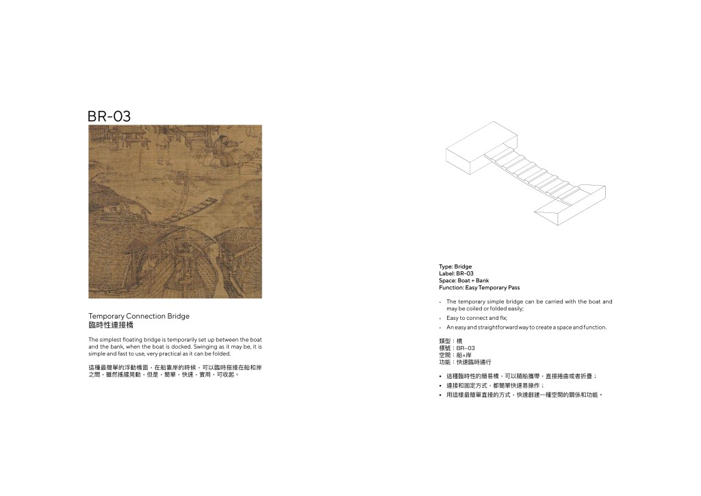 “Made in Bianjing” is a research project on “Adaptive Social Spaces” based on “A Journey Springtime Along the River.” It summarises and interprets 31 different types of architectural spaces depicted in the artwork, with 10 of these spaces reconstructed as 1:1 modular installations. These modules create an interconnected, walk-in environment, allowing visitors to explore the space and experience the connection between traditional architectural practices and contemporary, as well as future, urban development.