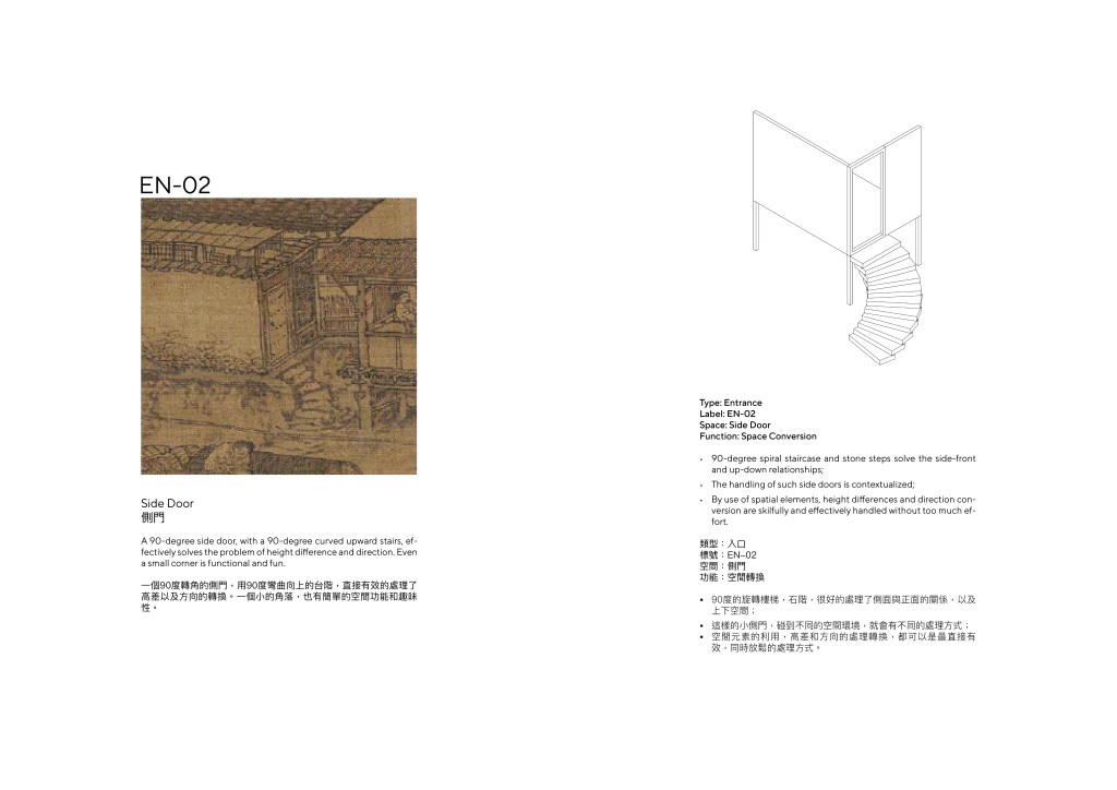 Chinese buildings, under rigid architectural rules, are classified in a hierarchy of types and complexity, but in general, they adopt a wood structure with a focus on the relationship between the slope roof and the column; through the sophisticated mortise-tenon connection, a kaleidoscope of architectural styles is created.