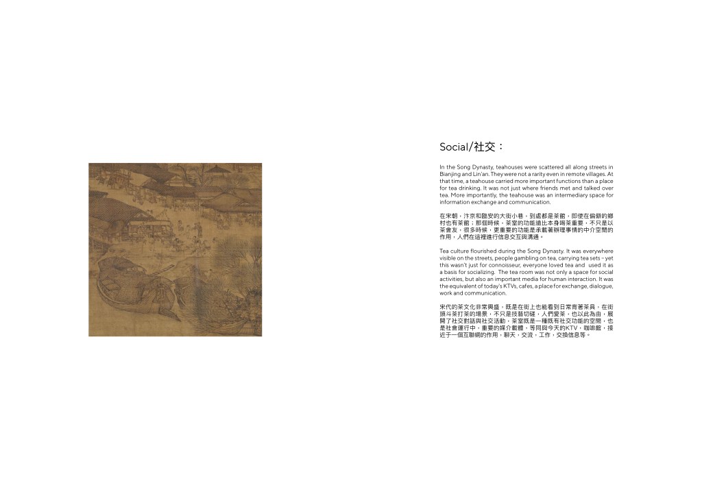 Tea culture flourished during the Song Dynasty. It was everywhere visible on the streets, people gambling on tea, carrying tea sets – yet this wasn’t just for connoisseur, everyone loved tea and used it as a basis for socializing. The tea room was not only a space for social activities, but also an important media for human interaction. It was the equivalent of today’s KTVs, cafes, a place for exchange, dialogue, work and communication.
