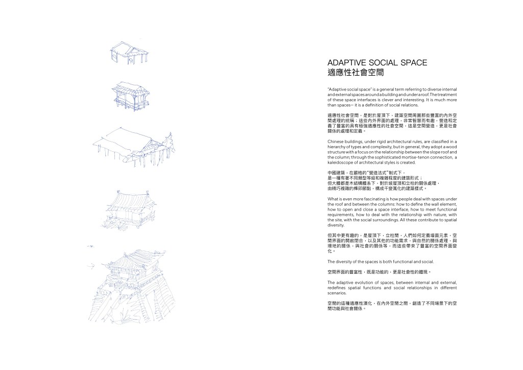 “Adaptive social space” is a general term referring to diverse internal and external spaces around a building and under a roof. The treatment of these space interfaces is clever and interesting. It is much more than spaces— it is a definition of social relations.