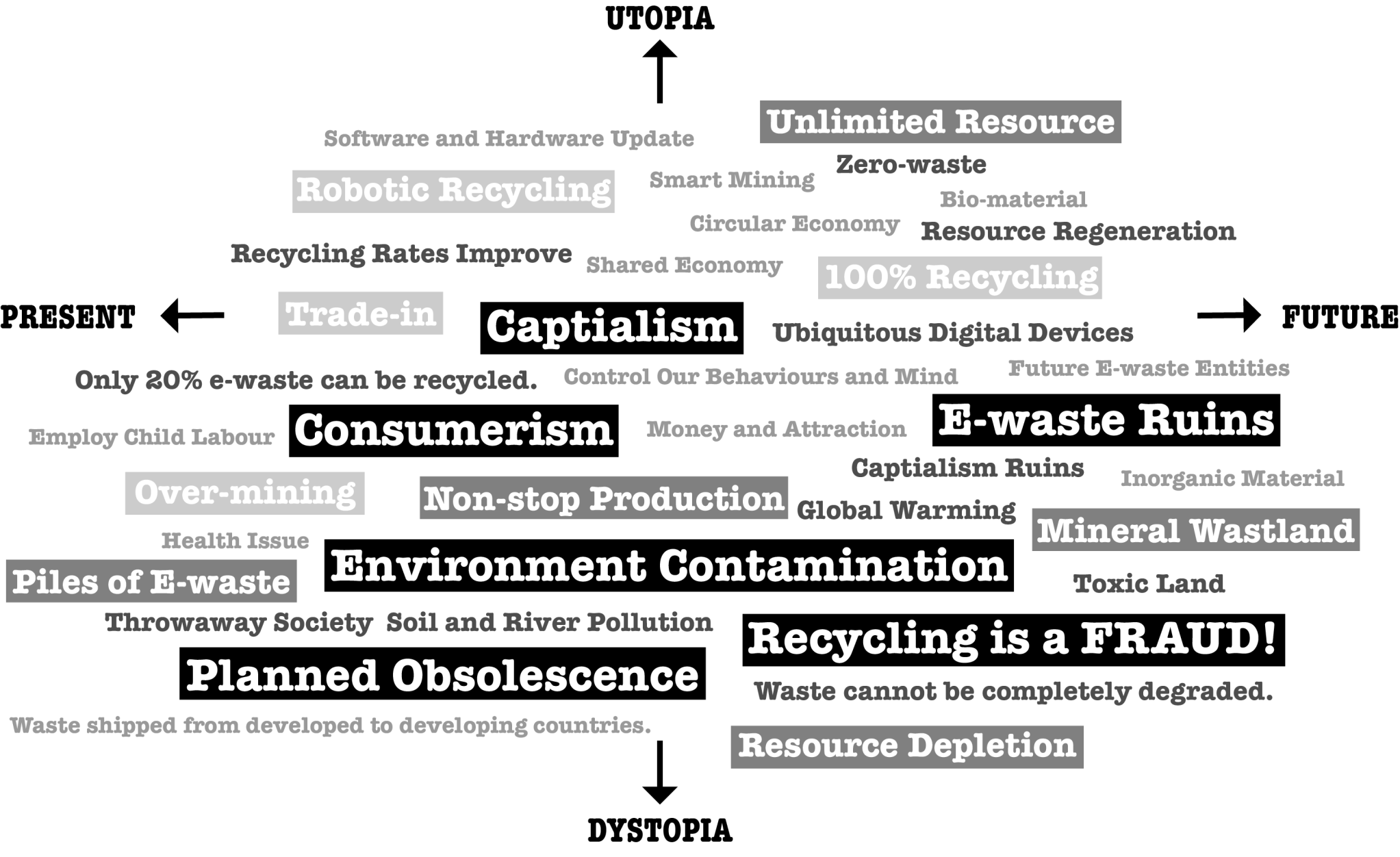 Wires, advertising screens, smartphones, and other digital devices made from multiple metals are scattered in every corner of the city. The city is overwhelmed by e-wastes.